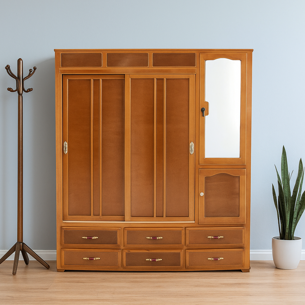 Tiene un espacio holgado para colgar prendas, así como entrepaños para tus accesorios, cajones amplios y espejo.