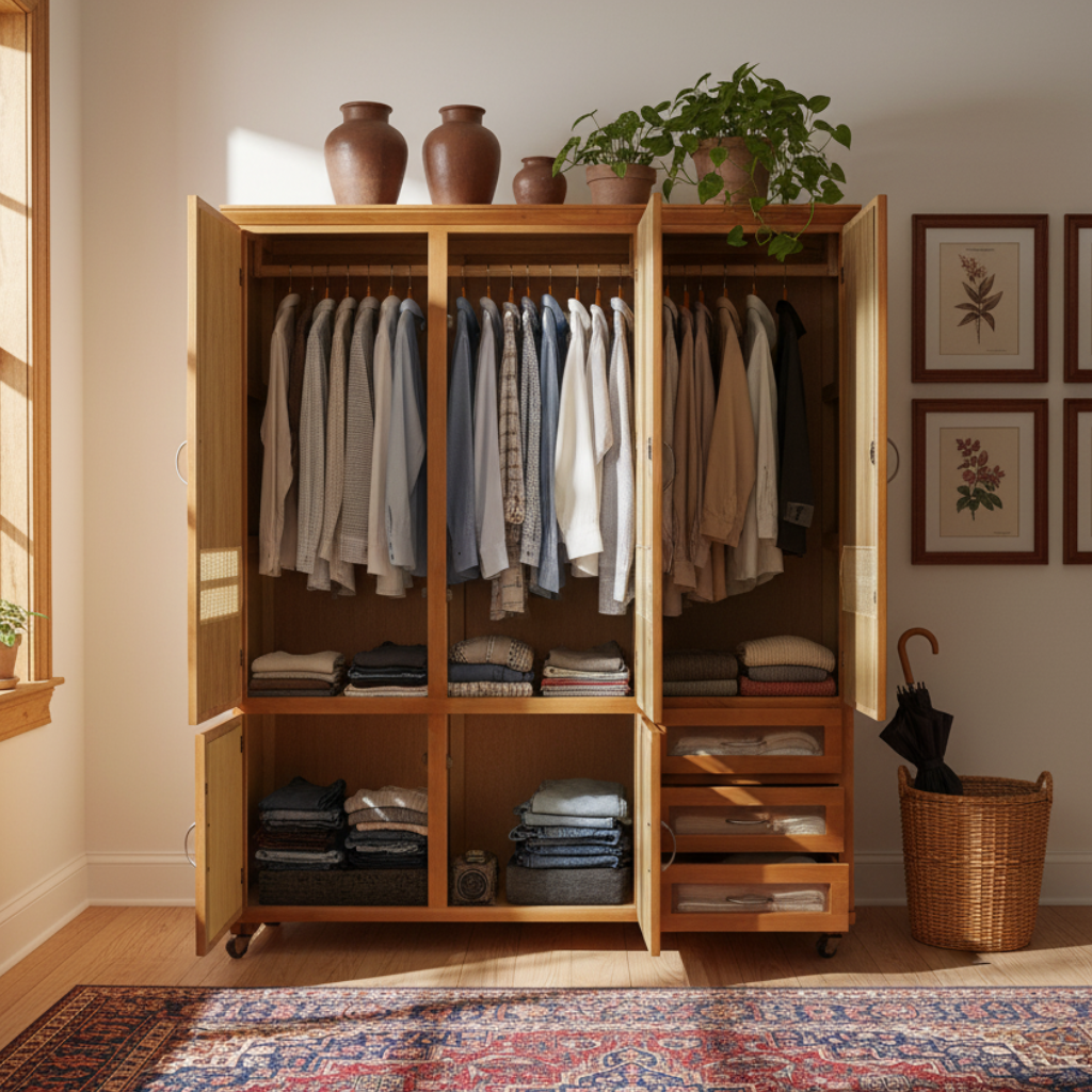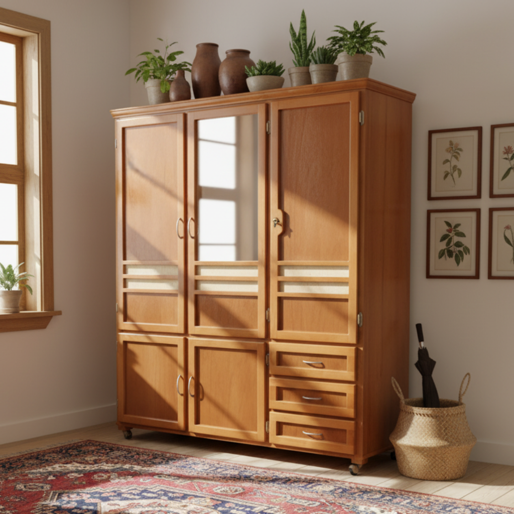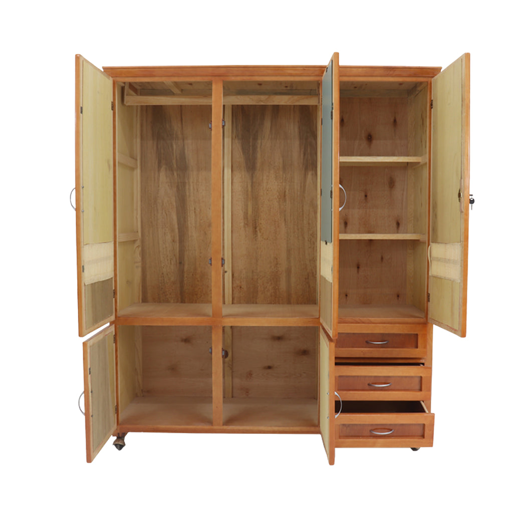 Tiene un espacio holgado para colgar prendas, así como entrepaños para tus accesorios, cajones amplios y espejo.
